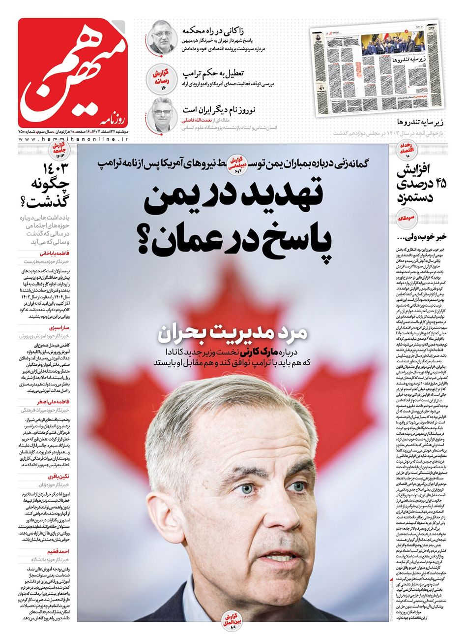 جهت خرید روزنامه هم‌میهن دوشنبه 1403/12/27 به لینک زیر مراجعه کنید. خرید روزنامه هم‌میهن از سایت جار